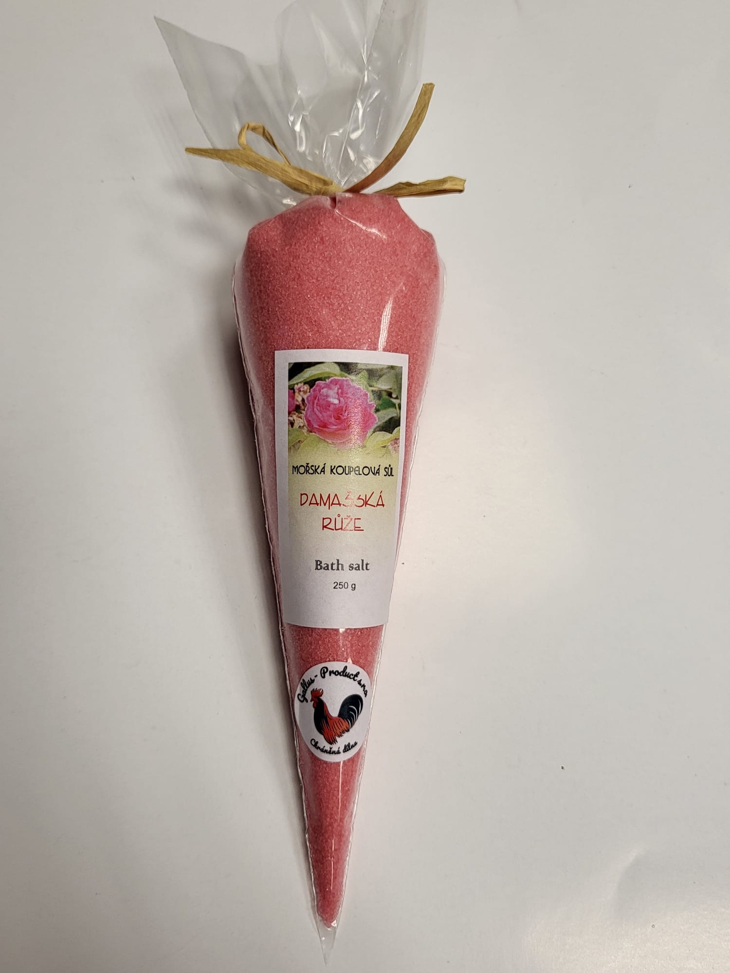 Ručně vyráběná koupelová sůl v kornoutu. Hmotnost 250 g. Damašská růže — koupelová sůl s vůní růže.