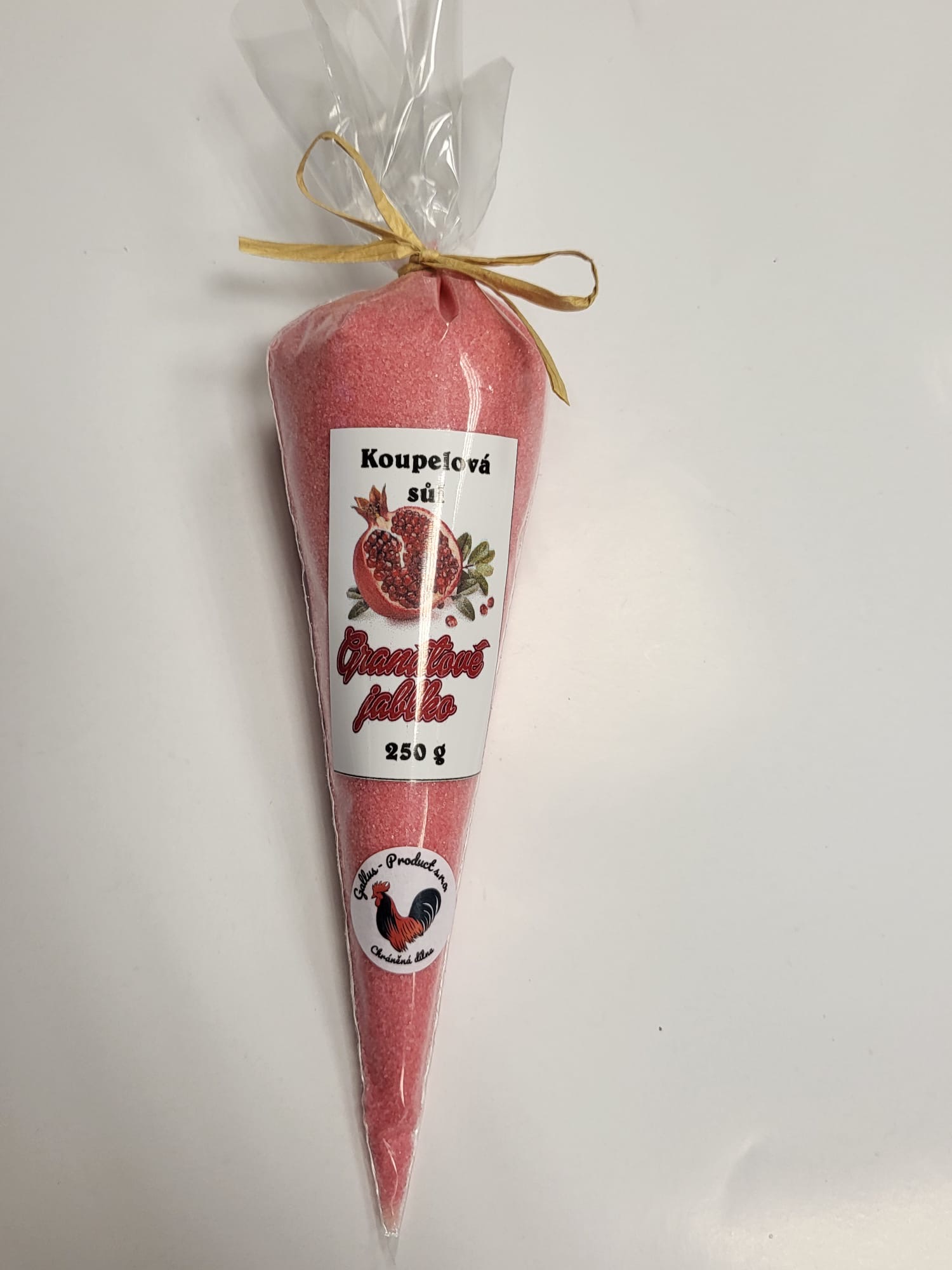 Ručně vyráběná koupelová sůl v kornoutu. Hmotnost 250 g. Granátové jablko — koupelová sůl s vůní granátového jablka.