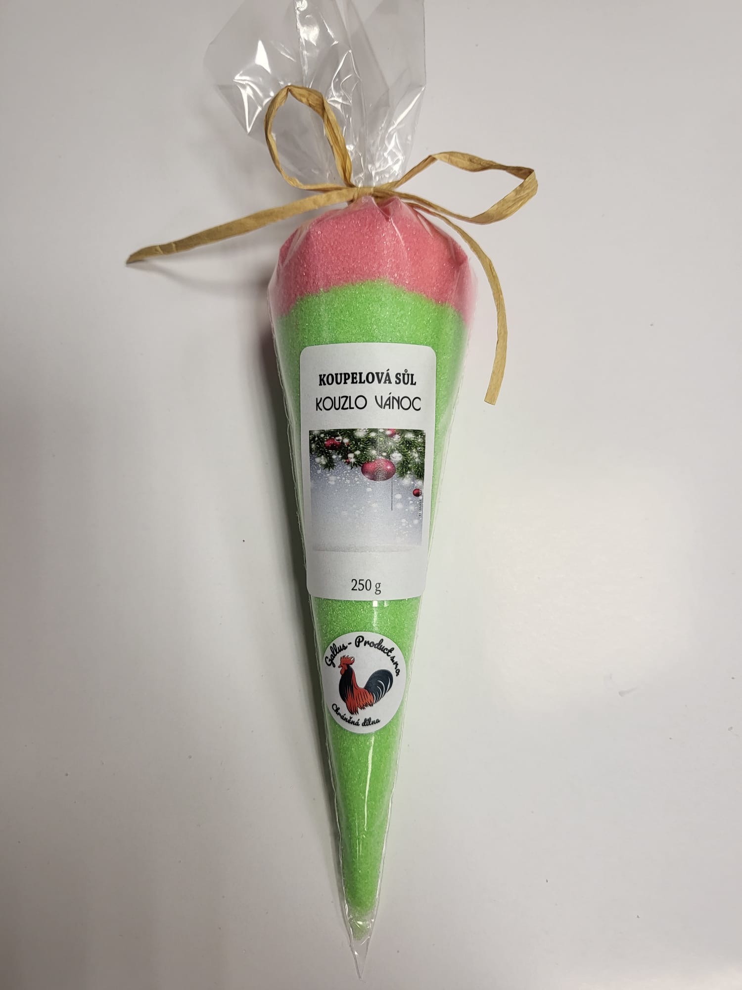 Ručně vyráběná koupelová sůl v kornoutu. Hmotnost 250 g. Kouzlo Vánoc — vánoční koupelová sůl.