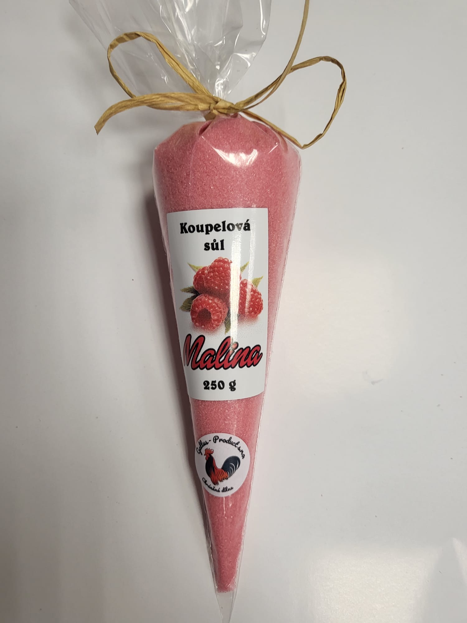 Ručně vyráběná koupelová sůl v kornoutu. Hmotnost 250 g. Malina — koupelová sůl s vůní malin.
