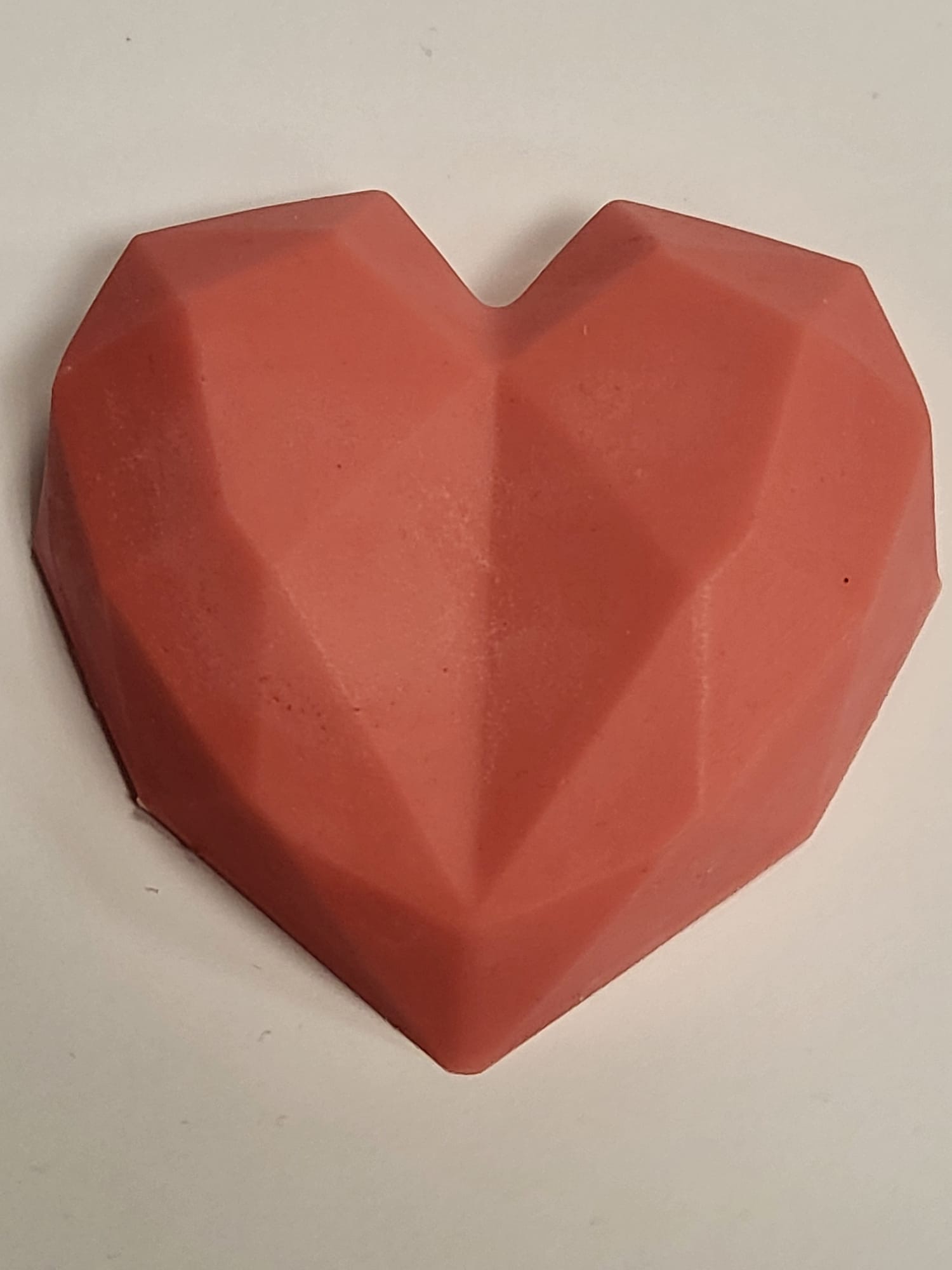 Ručně vyráběné dekorativní mýdlo ve tvaru diamantového srdce. Barva růžová, vůně květinová. Hmotnost 50 g, rozměr 6,5 × 6,5 cm.