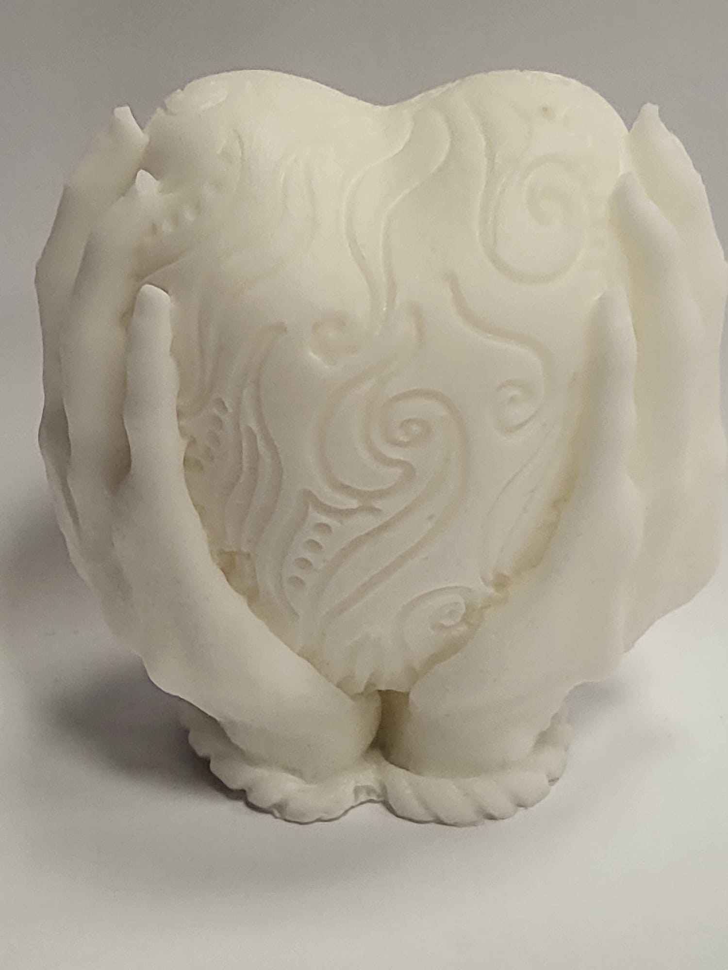 Ručně vyráběné dekorativní mýdlo ve tvaru srdce v dlaních. Barva bílá, vůně květinová. Hmotnost 210 g, rozměr 10 × 9 cm.