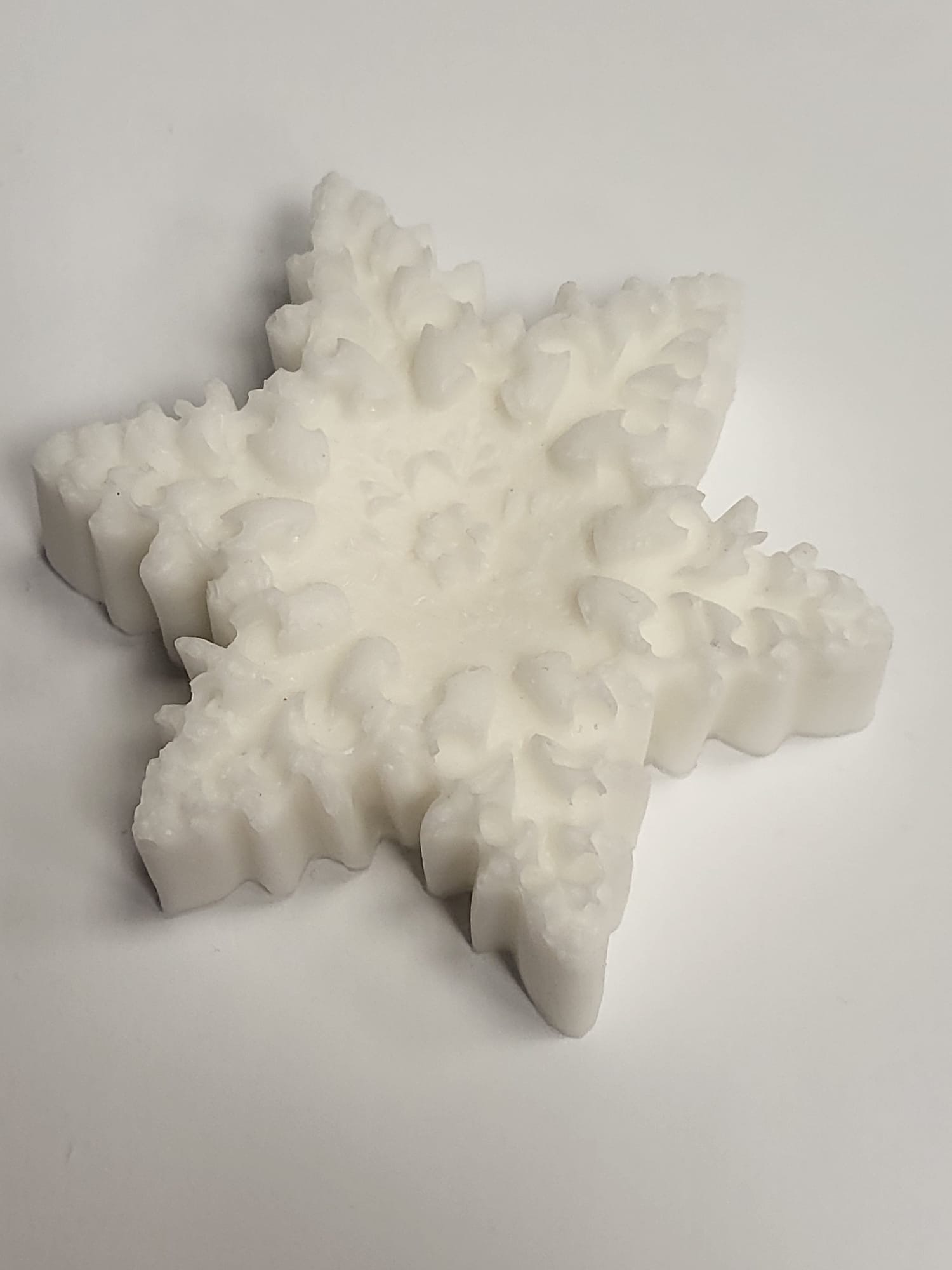Ručně vyráběné vánoční mýdlo ve tvaru sněhové vločky. Barva bílá, vůně vánoční. Hmotnost 50 g, rozměr 2 × 7 cm.