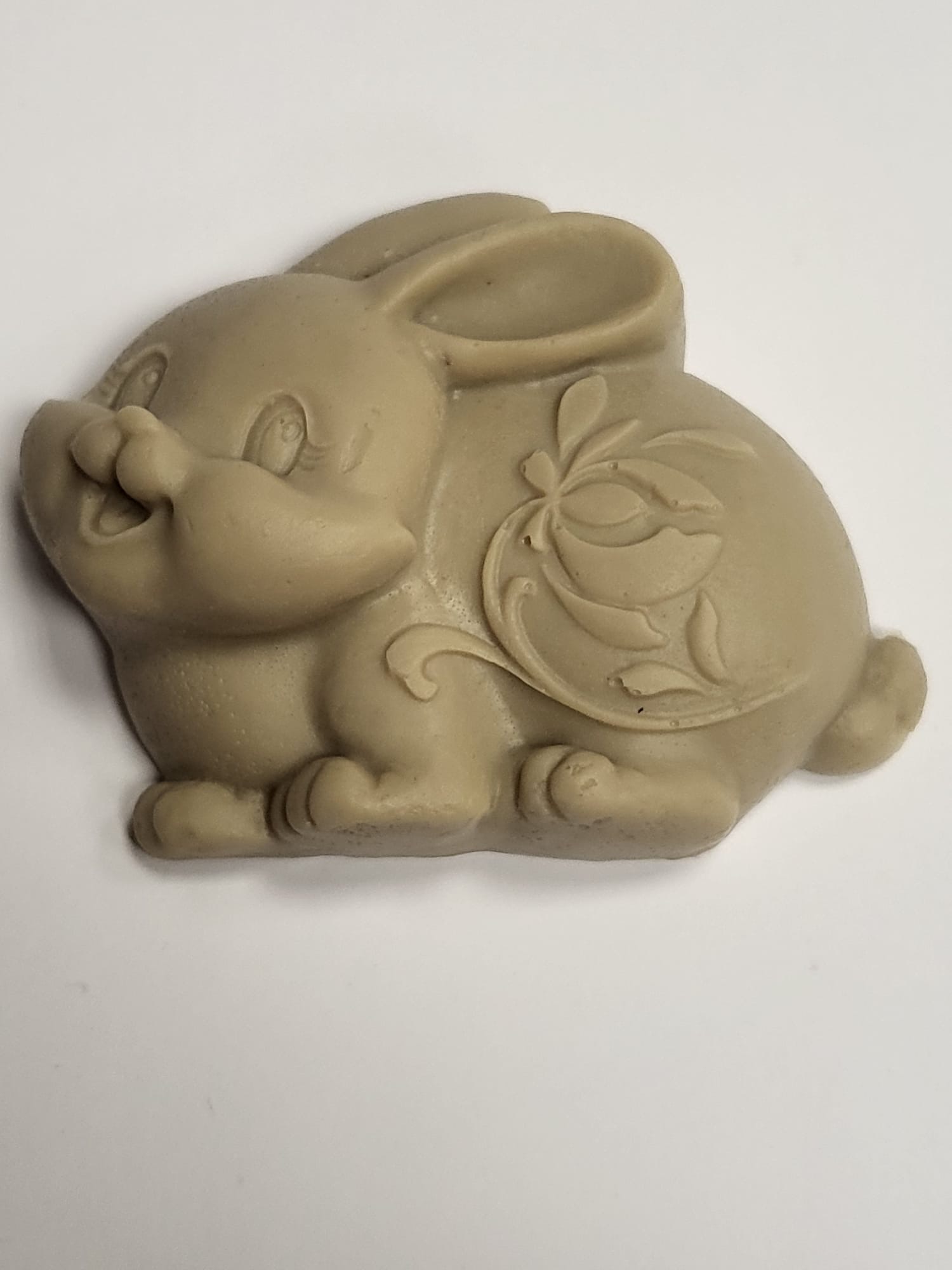 Ručně vyráběné velikonoční mýdlo ve tvaru zajíčka. Barva hnědá, vůně květinová. Hmotnost 40 g, rozměr 11,5 × 6 cm.